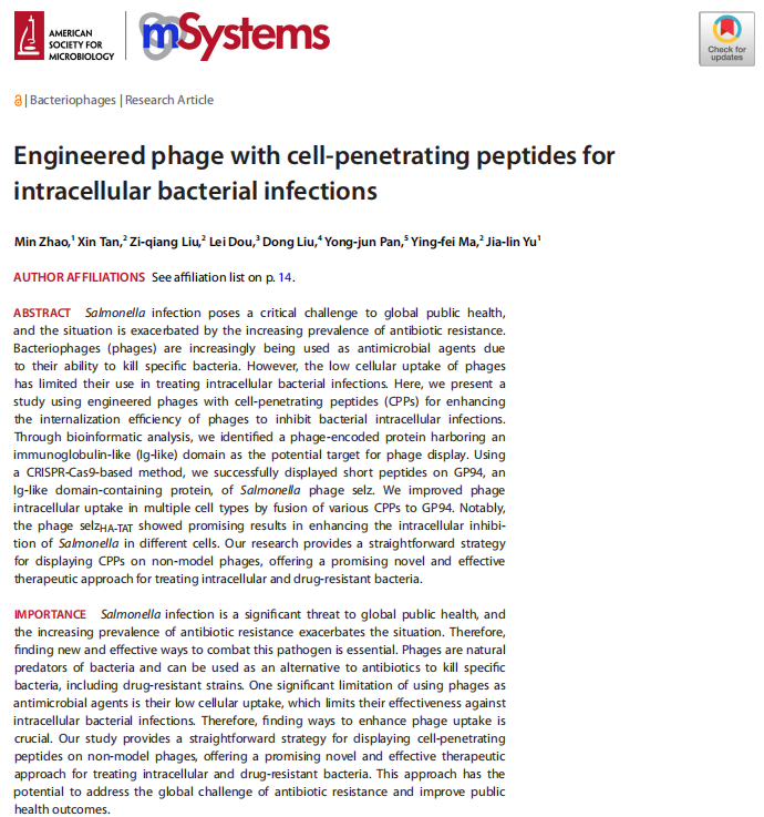 A research team from the Children’s Hospital of Chongqing Medical University, the Shenzhen Institute of Advanced Technology, Chinese Academy of Sciences, and other institutions has published a paper in mSystems entitled Engineered Phage with Cell-Penetrating Peptides for Combating Intracellular Bacterial Infections. Focusing on infections caused by Salmonella, a typical intracellular pathogen, and the growing clinical challenge of antibiotic resistance, this study developed an engineering strategy based on non-model bacteriophages. Using CRISPR-Cas9 technology, cell-penetrating peptides were displayed on the surface of GP94, an Ig-like domain protein of the Salmonella phage selz, which significantly improved phage internalization efficiency and enabled highly effective inhibition of intracellular Salmonella. This work established a universal and convenient engineering method for non-model phages, providing a feasible and highly efficient novel technical route for phage therapy against intracellular drug-resistant bacterial infections.