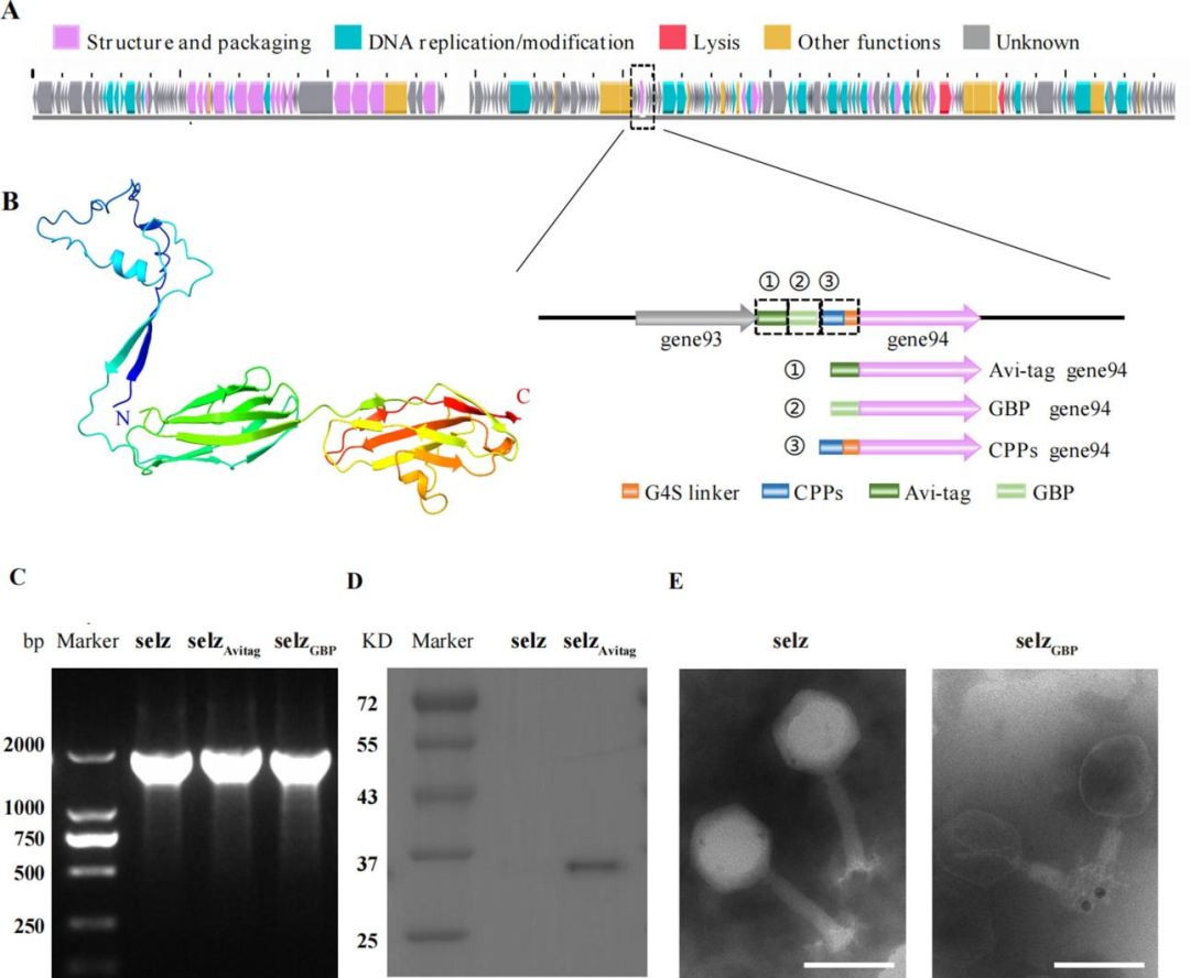 The Avi tag and a gold-binding peptide (GBP) were separately fused to the N-terminus of GP94 using CRISPR-Cas9 technology. Western blot analysis detected signals of biotinylated GP94 protein. Transmission electron microscopy (TEM) observed 10 nm gold nanoparticles bound to the tail of the selzGBP engineered phage, whereas no such binding was observed in the wild-type phage. These results confirm that GP94 can serve as a reliable site for peptide display.
