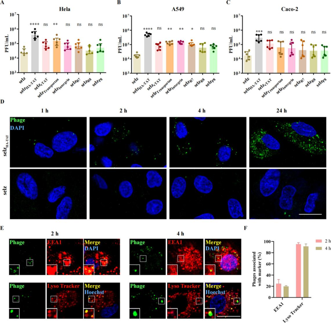 (III) CPPs Enhance the Uptake Efficiency of Phages in Mammalian CellsWild-type and engineered phages were co-incubated with HeLa, A549, Caco-2, THP-1 and Raw264.7 cells, respectively. Quantitative plaque assays showed that:In HeLa cells, the uptake of selz<sup>HA-TAT</sup> and selz<sup>Transportan</sup> was significantly increased;In A549 cells, the uptake of selz<sup>HA-TAT</sup>, selz<sup>Transportan</sup>, selz<sup>Integrin</sup> and selz<sup>R7</sup> was higher than that of the wild-type phage;In Caco-2 cells, only selz<sup>HA-TAT</sup> exhibited significantly elevated uptake, which was also the highest among all tested epithelial cells.
