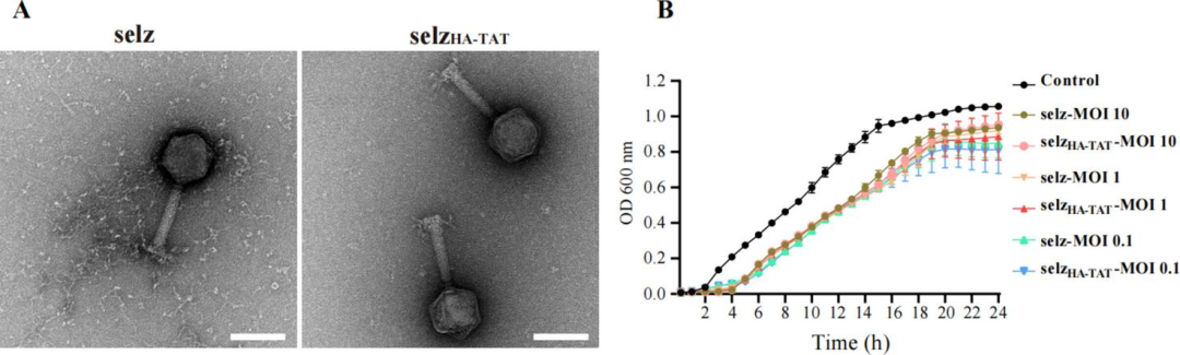 (IV) Characterization of Engineered Phage selz<sup>HA-TAT</sup> and Its Intracellular Bactericidal EffectTransmission electron microscopy showed that selz<sup>HA-TAT</sup> exhibited identical morphology to wild-type selz (width approximately 86 nm, length approximately 95 nm, contractile tail length approximately 113 nm). In vitro lysis efficiency against Salmonella was comparable at different MOIs.