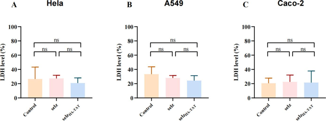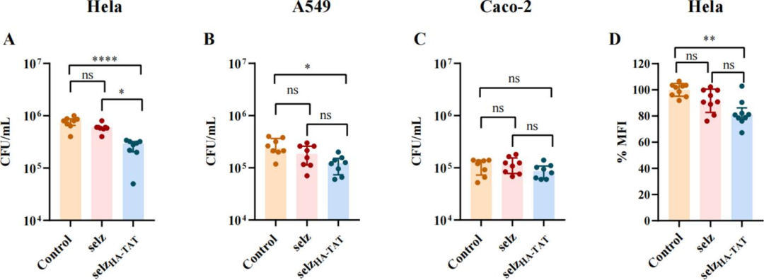 Intracellular bactericidal assays demonstrated that treatment with selz<sup>HA-TAT</sup> significantly reduced intracellular bacterial load in HeLa cells, with a bactericidal efficiency of 64%, and 48% in A549 cells, whereas no significant inhibitory effect was observed in Caco-2 cells. Flow cytometry confirmed an 18% decrease in mCherry fluorescence intensity of intracellular Salmonella in HeLa cells, providing direct evidence for effective elimination of intracellular bacteria.